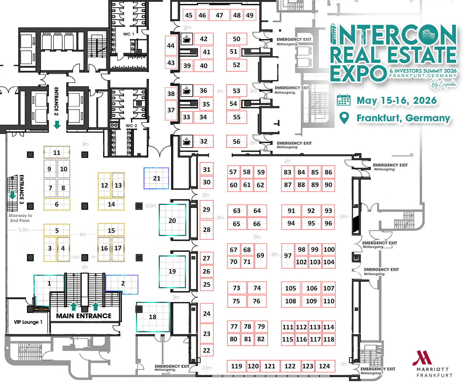 Check the layout of the InterCon Real Estate EXPO & Investor Summit 2026 with our detailed floor plan. You can choose the perfect spot to showcase your projects, maximize your exposure, and connect with key investors and decision-makers at the at the prestigious Marriott Frankfurt Hotel in Frankfurt, Germany.